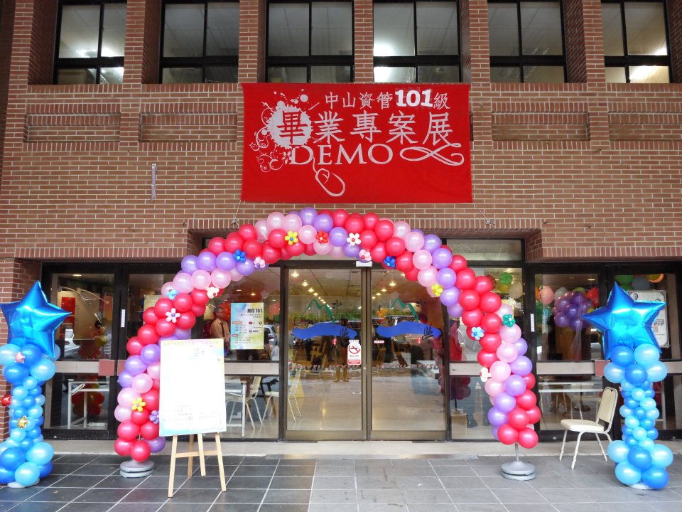專案簡報之後的隔天,就開始為期三天專案展示了。小編選擇在展示第二天、也正好是校慶第一天近距離訪問並且觀摩各組的專案內容。一走進圖書館一樓後方,就能看到氣球做成的拱門、專案展的精美海報,以及穿著西裝套裝的學長姊們忙著為來賓們解說系統。