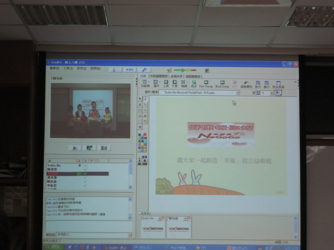 「以上是我們這組的成果及口頭報告,謝謝大家!」12/17(六)透過跨校視訊連線作期末報告,當最後一組同學致上謝詞,也代表著『2011秋季NeGoGo網站跨校創意行銷競賽』終於告一個段落。