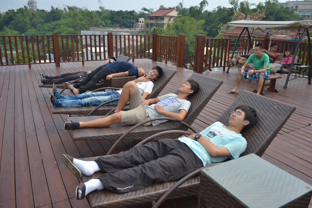 在華仁的帶領下,我們在用餐前參觀了莊園中的Villa,真的相當的舒適而且隱密,絲毫不輸峇里島的Villa喔!我們也因此認識了什麼是「土角厝」,磚塊的組成是「黑糖」、「稻草」及「泥土」所組成,讓我們這次同學會增添了幾分知性。這次的餐點華仁也在菜色方面幫我們動了一些手腳,讓我們享用了東港相當道地的「東港三寶」,大家在用餐過程當中真的是「有吃又有拿」,餐點根本多到吃不完都還可以打包回家,最後華仁還特別將已經打烊的「等路小舖」開店讓我們進去參觀選購他們的特色商品,大家又是大包小包的拼經濟,可見得大家是多麼的開心啊!