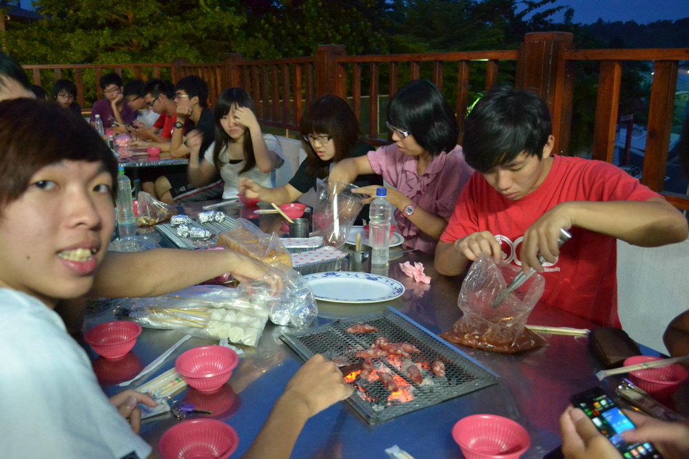 在停留著名的蚵殼島及遊湖活動結束後,接下來就是今天的另一項重頭戲「烤蚵吃到飽」,工作人員在我們上岸前就已經準備好剛撈上來的鮮蚵,並且幫我們生好火也烤好一部分「蚵仔」讓我們享用,所有的人無論是老師、同學或是眷屬,相信對大家來說都是一個難得的體驗,還有同學說光是吃這個烤蚵就把交的錢全部都回本了!最後真的是多到大家都吃不完,大人小孩都吃的不亦樂乎。
